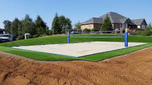 All it takes it some space that is clear of low hanging tree branches or wires and you can have a sand volleyball court installed. Court size sand volleyball courts are typically 8 meters x 16 meters for two player teams and increases to 14 meters x 24 meters for 3 4 or 6 player teams. Flush grade backyard sand volleyball court 3 court drainage pvc and gravel depending on how well your soil drains overlay the court area with a few inches to a one foot thickness of pea gravel.