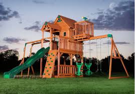 With numerous options available directly from the largest manufacturer of residential swing sets in the us the backyard discovery line has something for every family. This wood swing sets from creative cedar will encourage hours of active and engaged playtime with a variety of activities in your own backyard. When it s hot wooden swing sets designed with fun forts provide a shady hideaway for little ones.